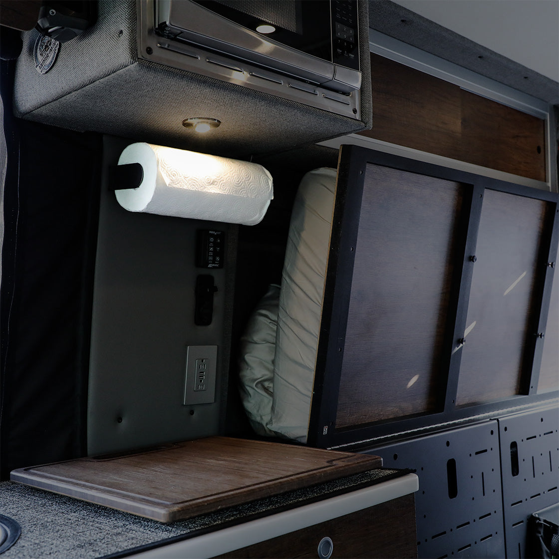 We pre-drill holes so you can mount it on the wall under the microwave by using the two existing screws. No new holes needed and no damage to your interior walls.
