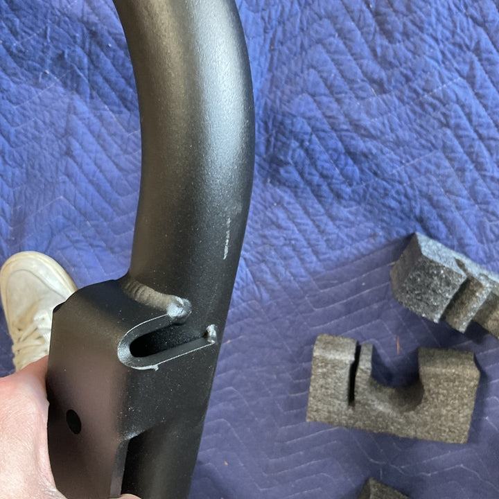 Close-up of black steel arm of Sprinter Bike Rack and Box Carrier on blue padded surface with foam packaging pieces