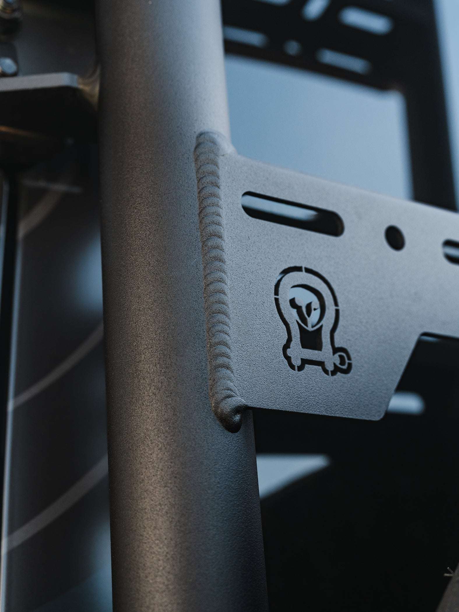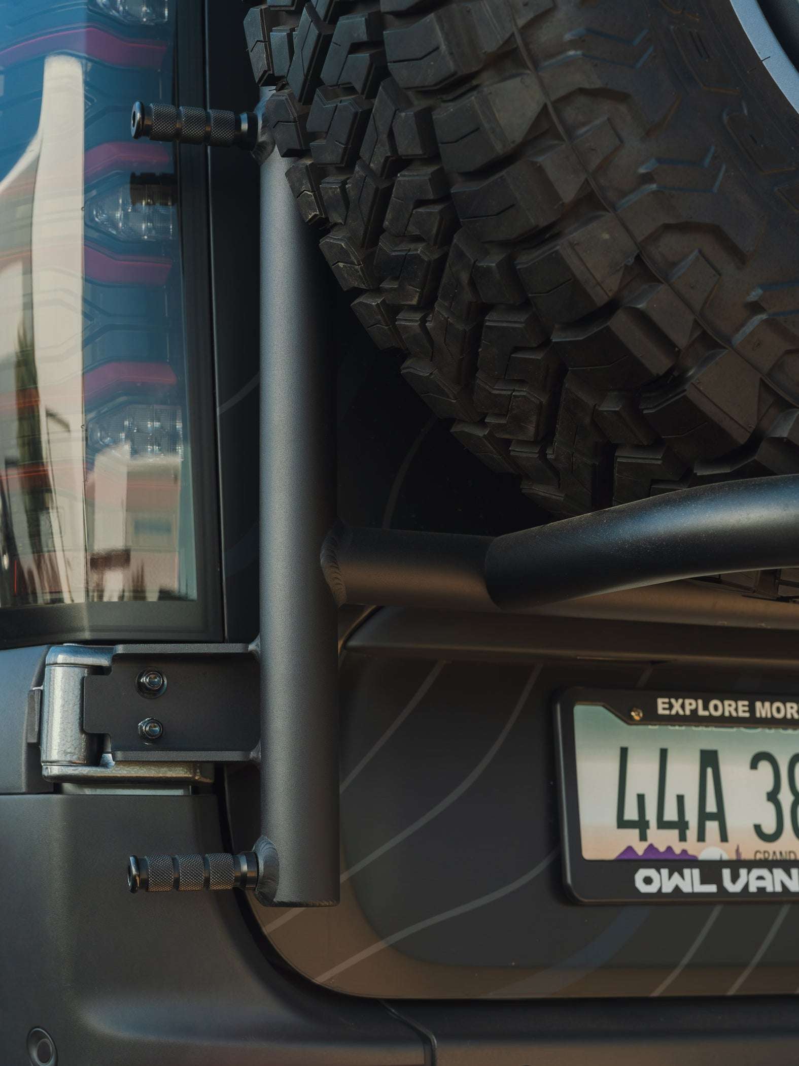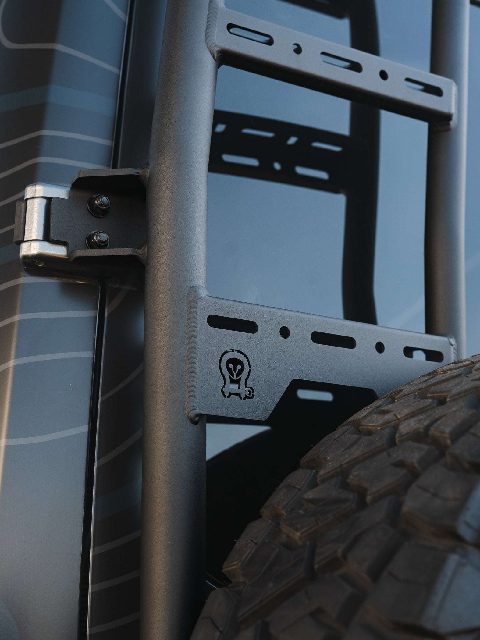 Close-up of Owl Explorer sprinter tire carrier and ladder with TIG-welded aluminum and powder coat finish
