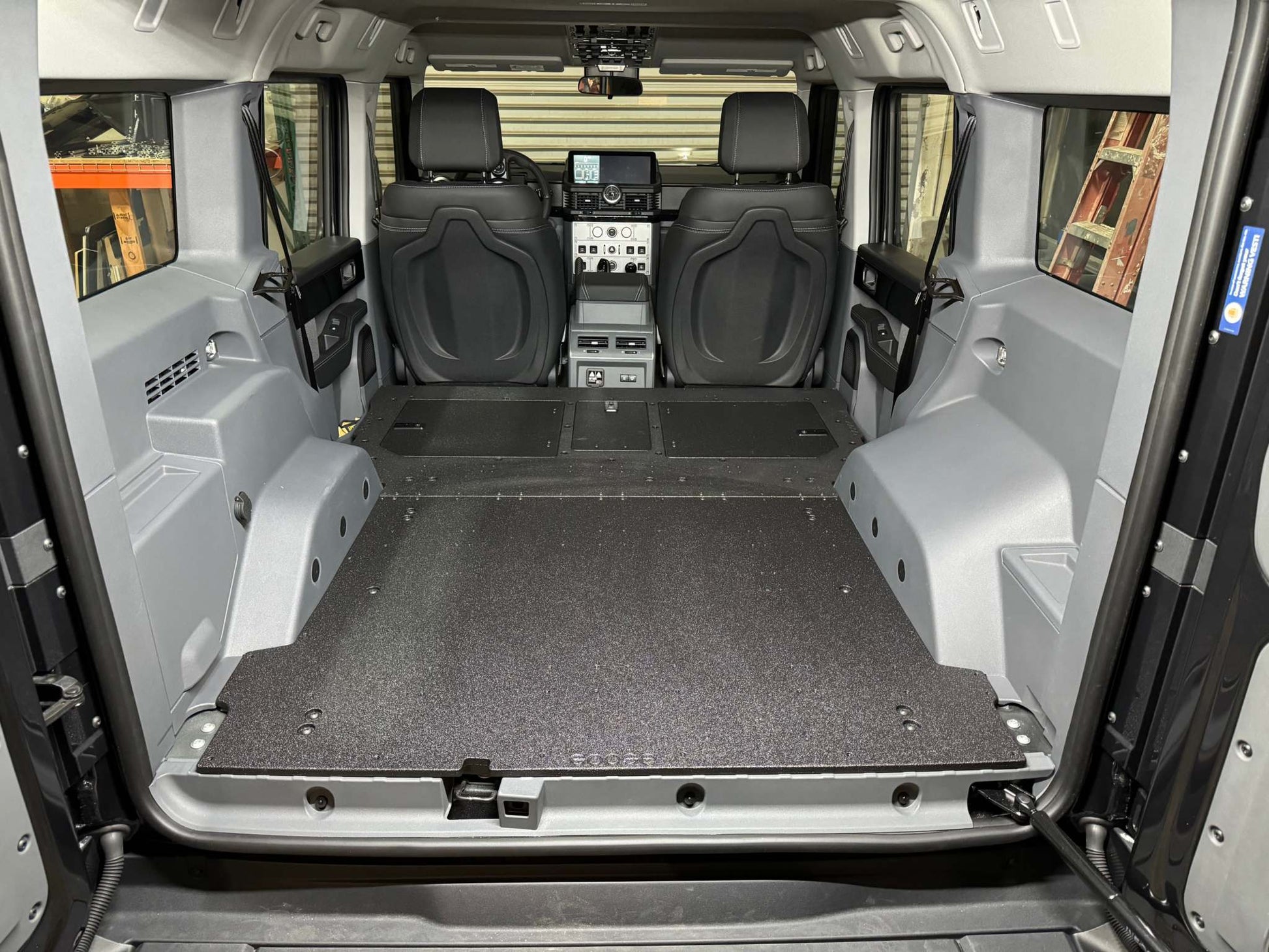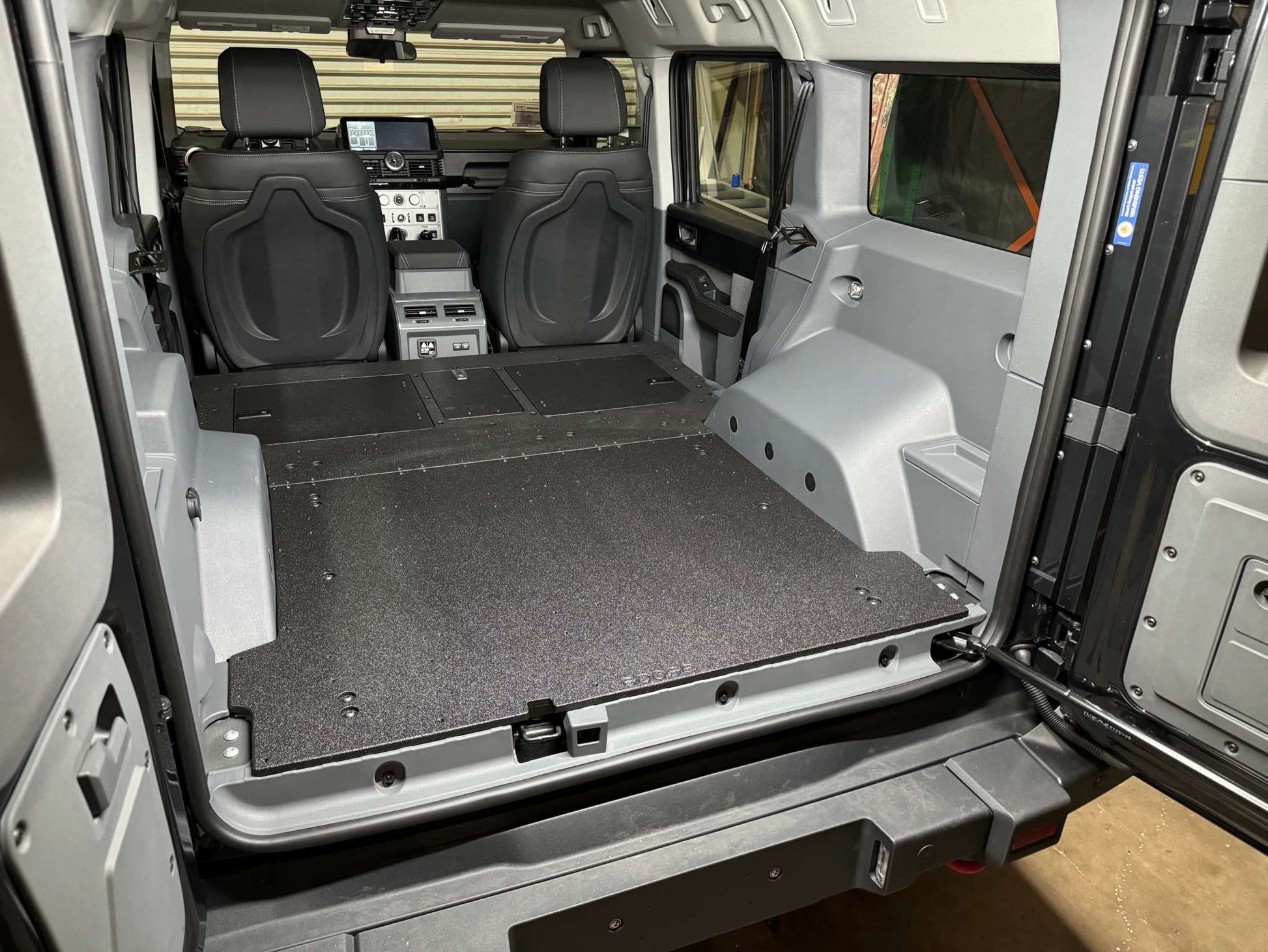 Explore Series second row seat delete plate system installed in Ineos Grenadier interior creating flat rear surface