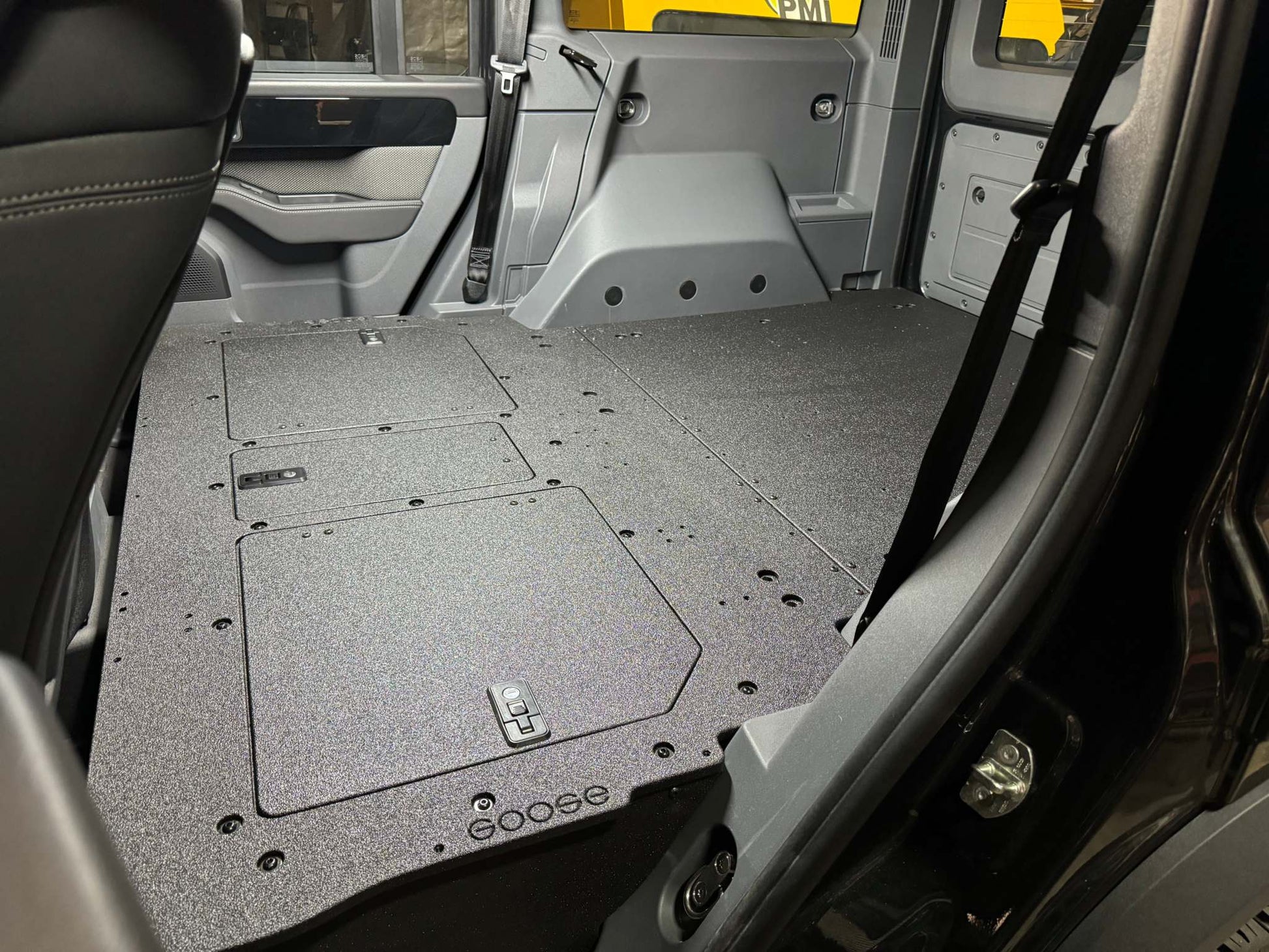 Maximize the functionality of your Ineos Grenadier with the Second Row Seat Delete Plate System™, engineered to provide ample storage space and compatibility with Goose Gear Modules or your own custom storage system and accessories. This 100% second-row delete requires the removal of the seat, seat frame, and the surrounding plastic trim panels that house electrical components under the factory seat.