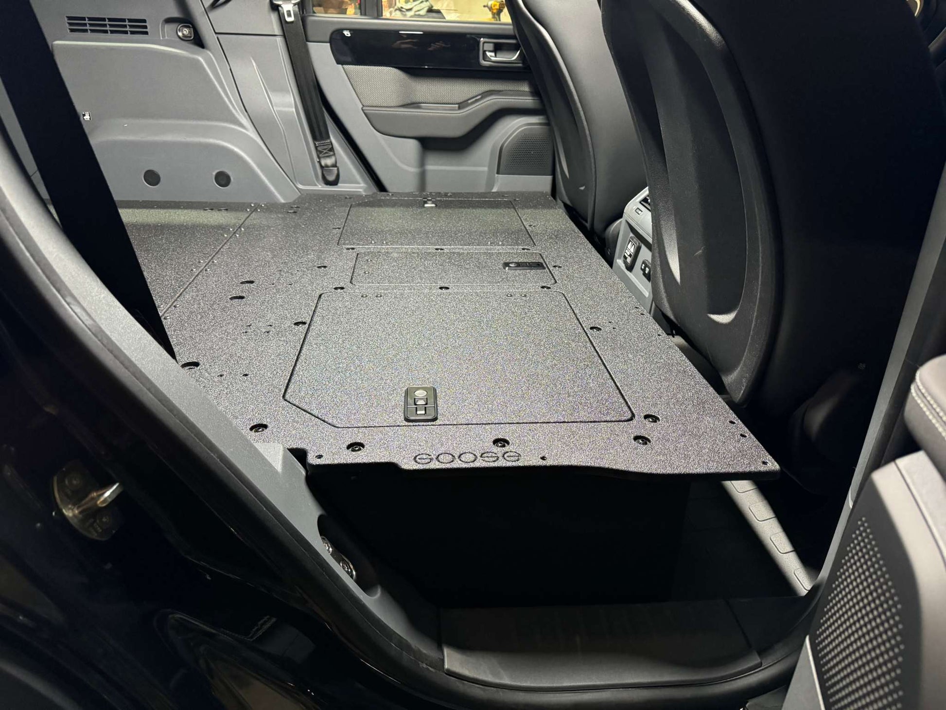 Explore Series Second Row Seat Delete Plate System installed creating flat cargo space with access hatches