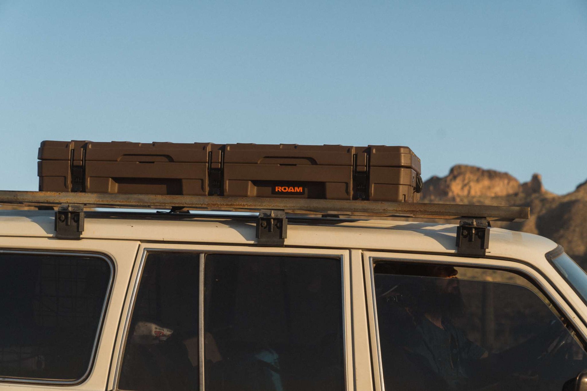 ROAM 83L Rugged Case in brown mounted on vehicle roof, rugged heavy-duty storage for outdoor gear and recovery equipment