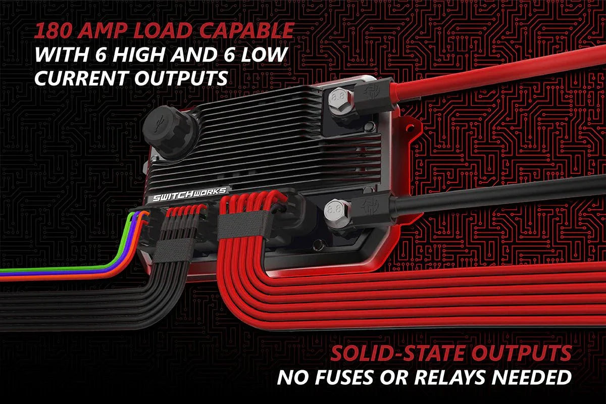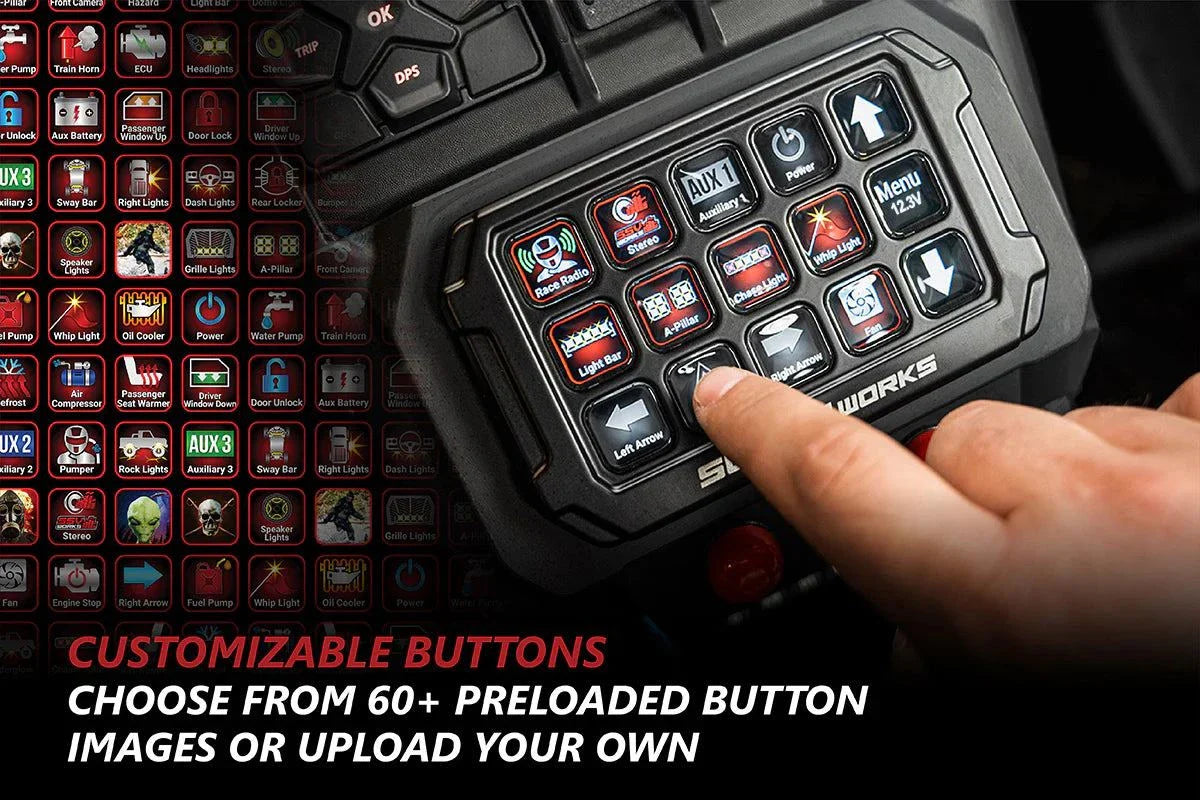 Behind each individual button is an LCD screen. This means that you can digitally change your icon, and access menus through the buttons. From live-amperage readings, to button action setup, everything you need is easily accessible without the need of downloading an app. Whether you want your accessory to work with or without the ignition on, simple push ON/push OFF or one of the many other functional features, You can quickly and easily set the function for each output. The beauty of running an electronic solid state system. is your output location (the slot you wire your accessories) doesn't determine the button location. You can choose button 1 to control output 3, or 4, even both! The possibilities are endless.